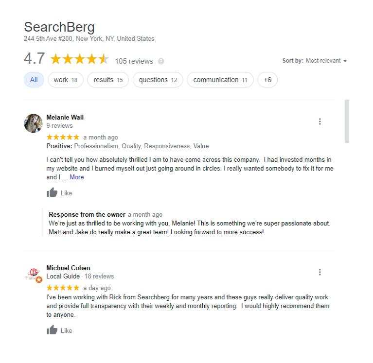 "The name of my business happens to be a competitive keyword other businesses are trying to use to come up before me in Google searches. Thanks toSearch Berg, I've gone from page 10 to page 2 in less than a month. This is the reason I am now reselling their services."